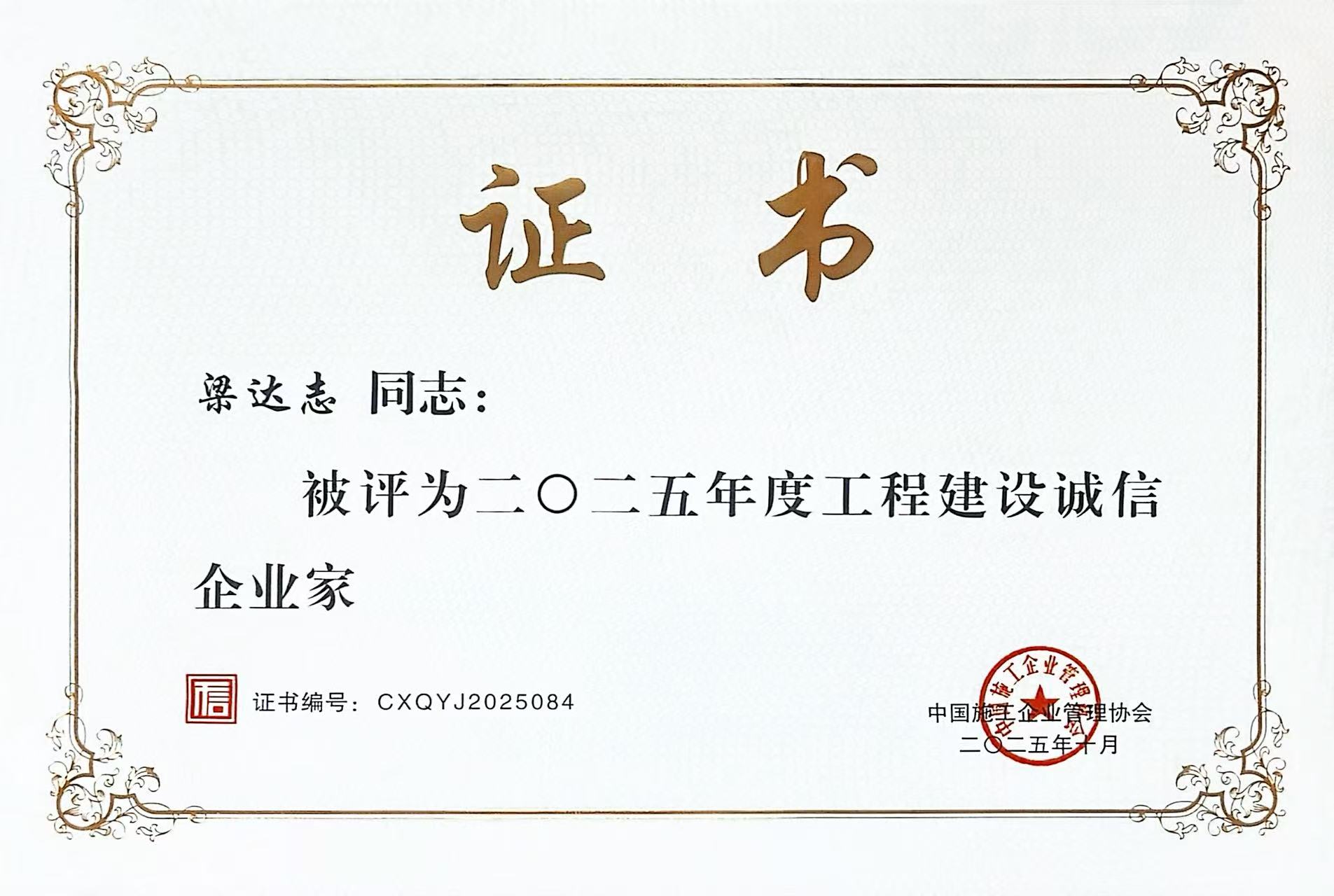 喜报!集团总裁梁达志荣获“工程建设诚信企业家”荣誉称号