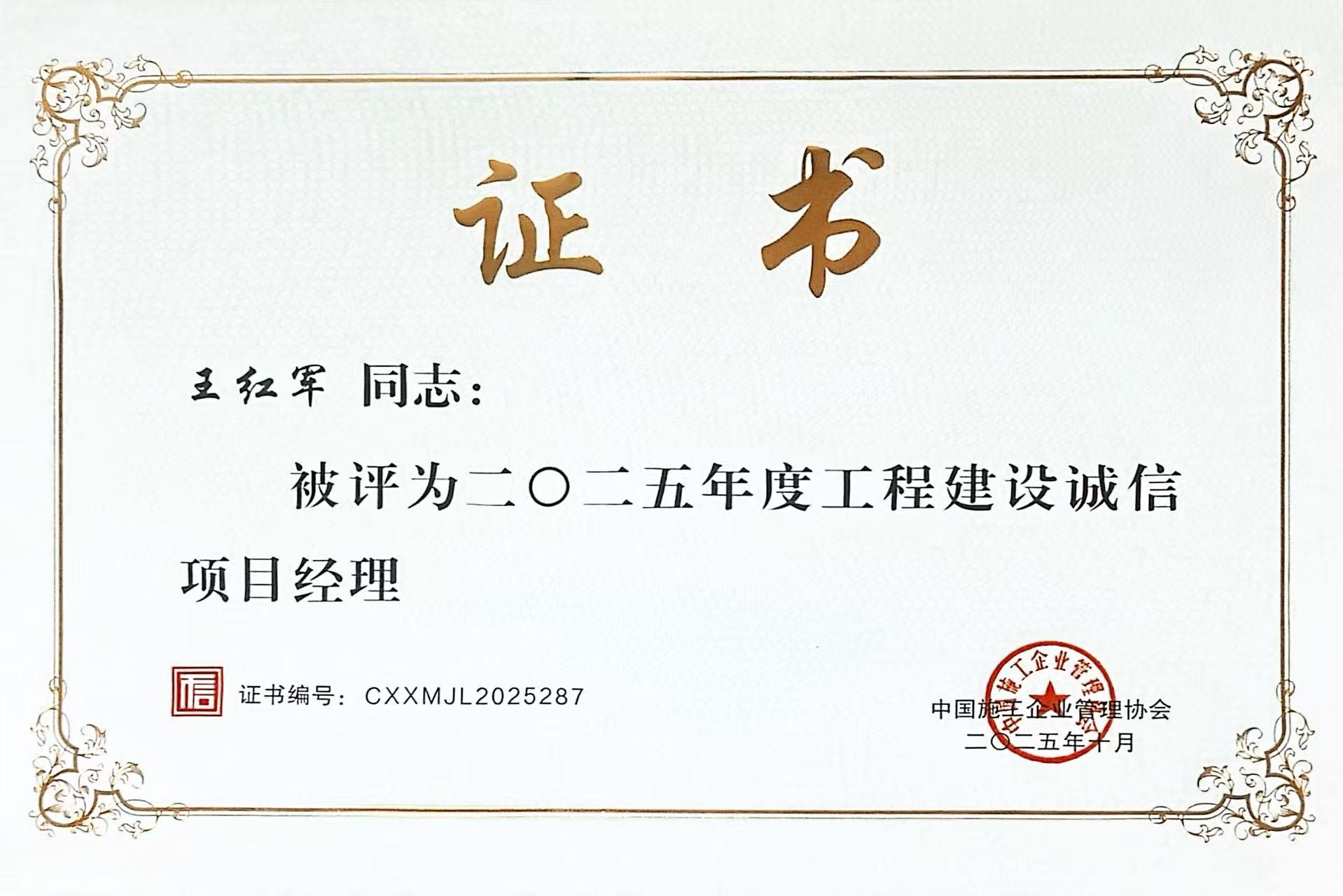 近日,在中国施工企业管理协会第十四届工程建设行业诚信发展大会上,国信监理集团总裁梁达志荣获“工程建设诚信企业家”荣誉称号,项目总监王红军荣获“工程建设诚信项目经理”荣誉称号。